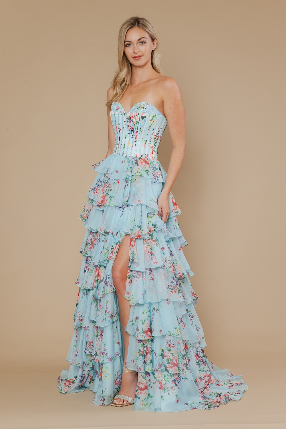 Elegant A-line dress crafted in lightweight chiffon, featuring a delicate floral print and a flowy ruffle skirt that adds soft movement and feminine charm. Perfect for prom, formal events, or special occasions