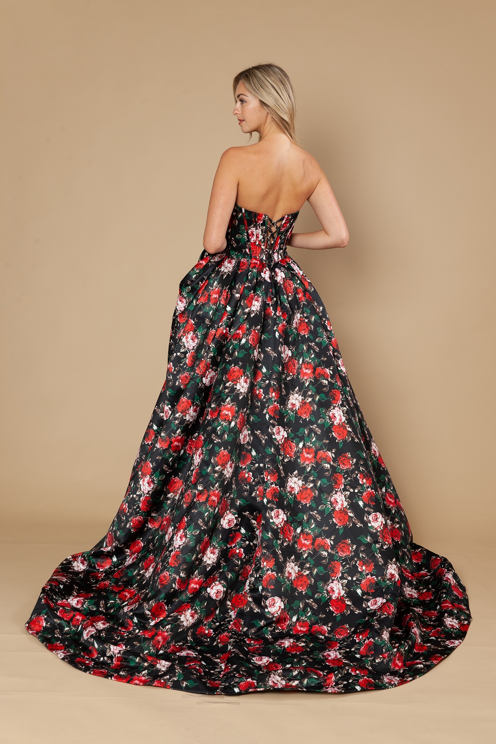 A-line satin prom dress with floral print, strapless structured bodice, lace-up back, matching side waist flower made from the same fabric, front slit, and elegant train. Perfect for prom.