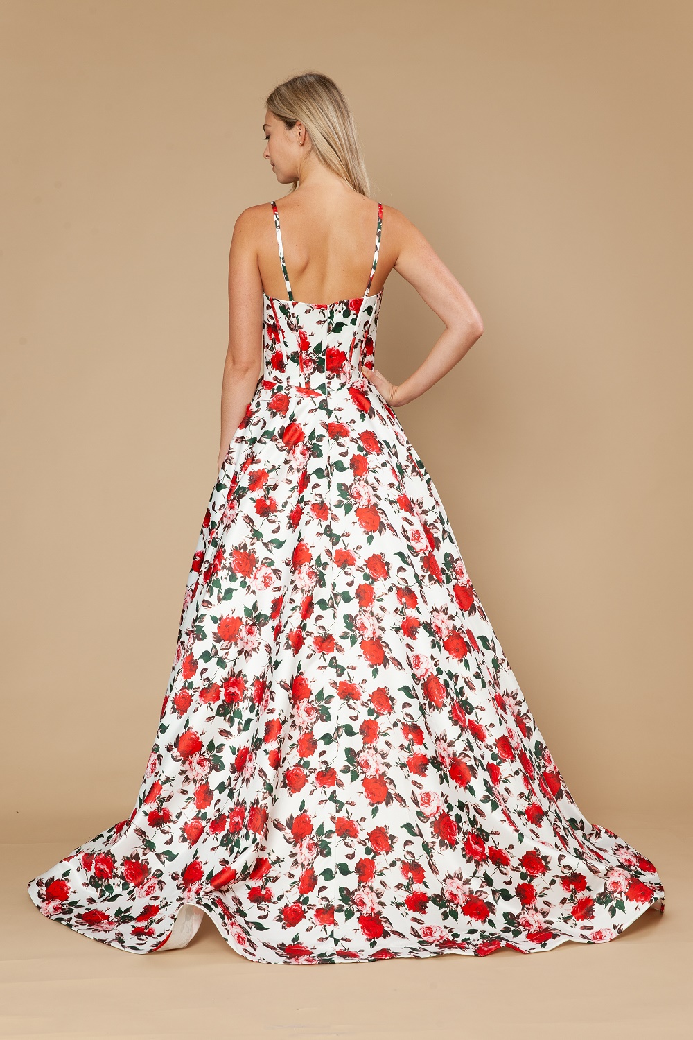 Elegant A-line prom dress crafted in smooth satin with a romantic floral print. Designed with a zipper back for a secure fit and a matching side waist bow made from the same fabric to enhance the silhouette. The flowing skirt creates a timeless and feminine look, perfect for prom and formal events.