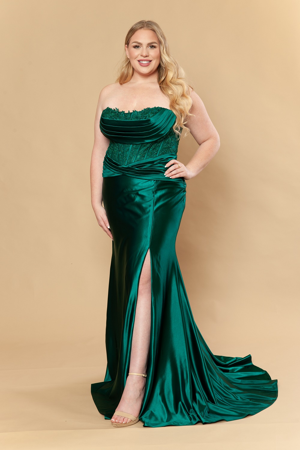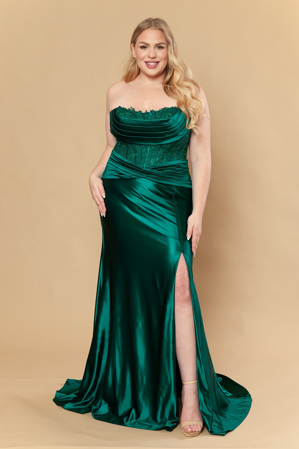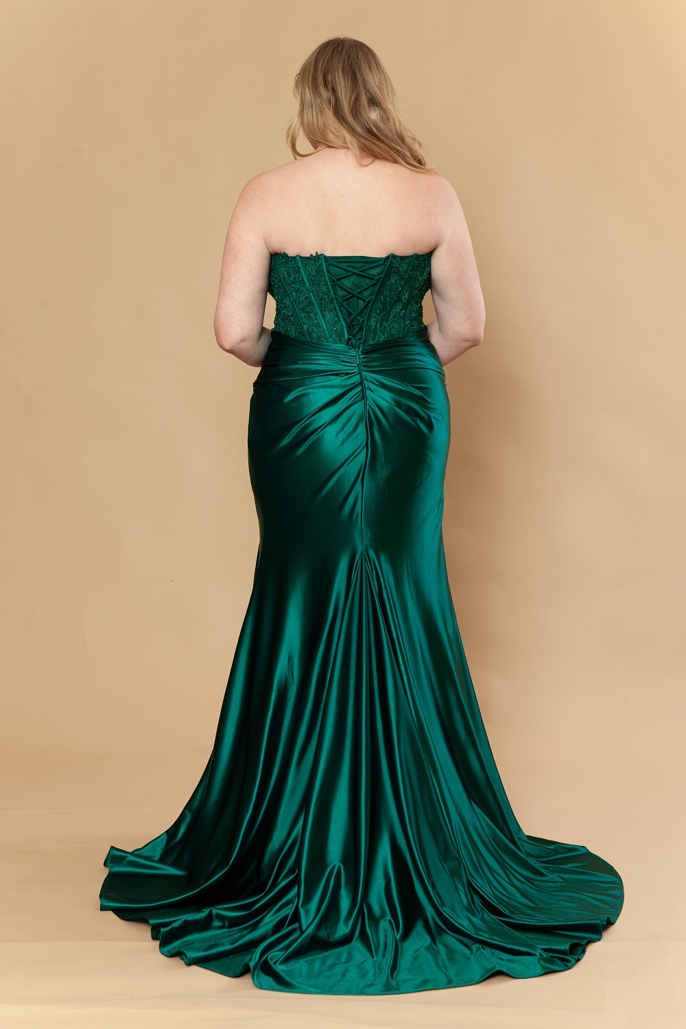 Curve Prom Dress – Emerald Green Fitted Satin with Embroidered Bodice