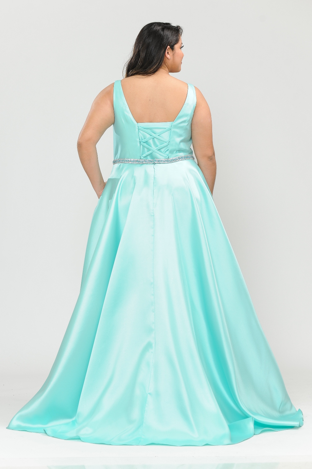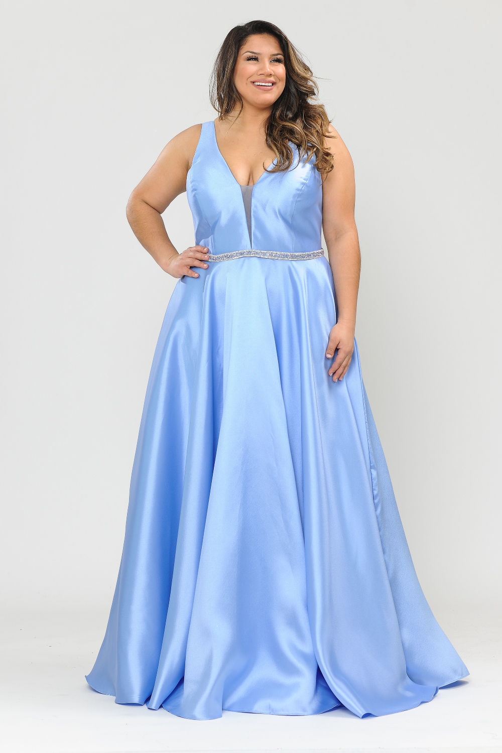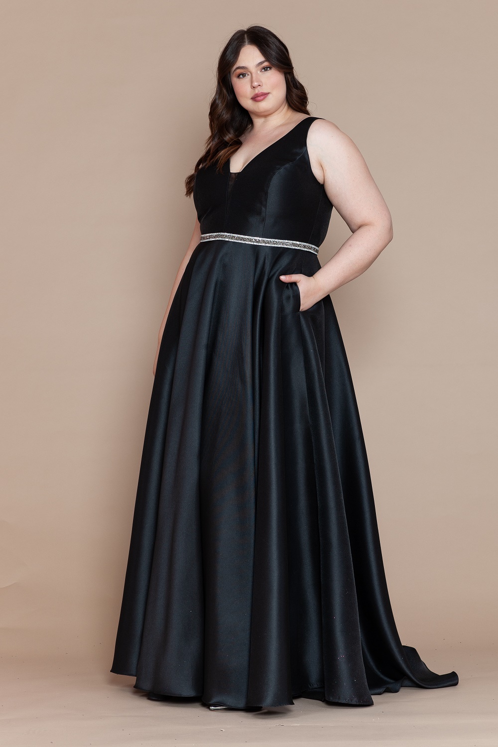 Make a statement at prom or any formal event with this curvy A-line gown designed to flatter and support your curves. Featuring a deep illusion V-neckline and an elegant open back, this dress creates a striking yet refined silhouette. A sparkling rhinestone belt defines the waist beautifully, while the structured corset back with zipper closure ensures a secure, customized fit. Finished with practical pocket details and a flowing A-line skirt, this gown is perfect for prom, galas, and special occasions.