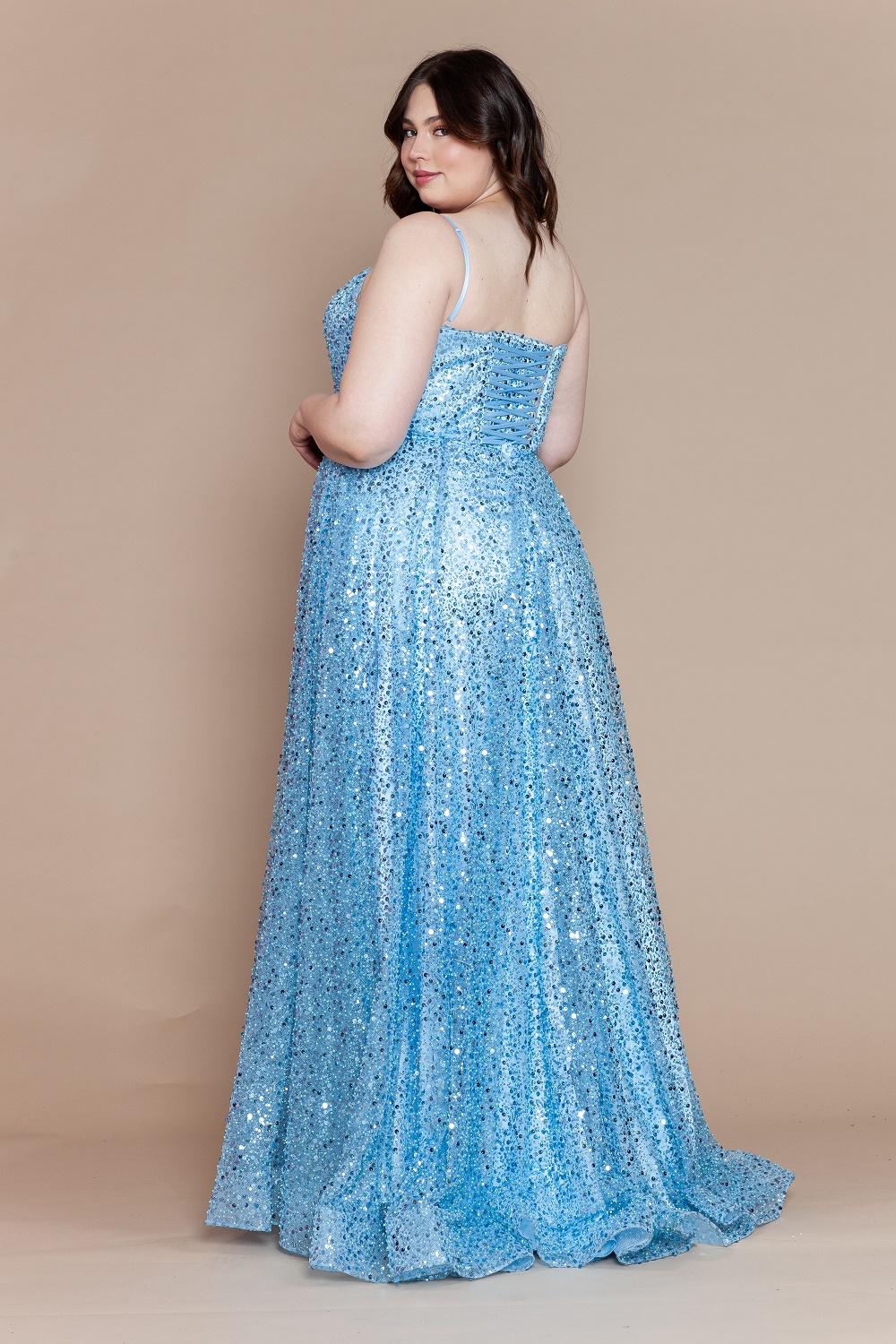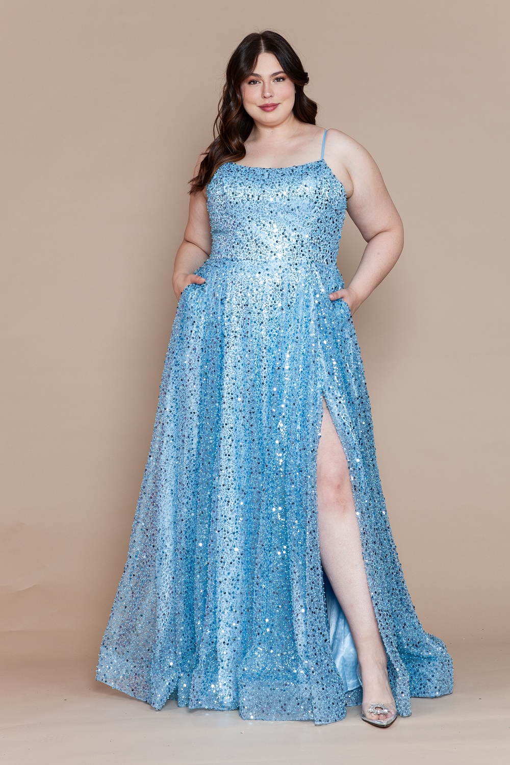 Elevate your prom or special occasion look with this curvy pearl sequin mesh dress, designed to highlight and flatter plus-size curves. This full-length gown features a modern square neckline and shimmering sequin glitter throughout for a radiant finish. A front slit adds elegance and movement, while functional pocket details offer a practical yet stylish touch. Delicate spaghetti straps frame the shoulders beautifully, and the adjustable corset back ensures a secure, customized fit. Perfect for prom, formal events, galas, and unforgettable evenings.